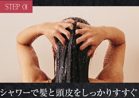 1.頭皮と髪をしっかりとぬらし埃や汚れをぬるま湯で浮き上がらせる。