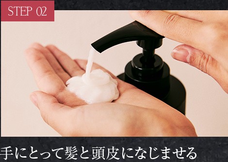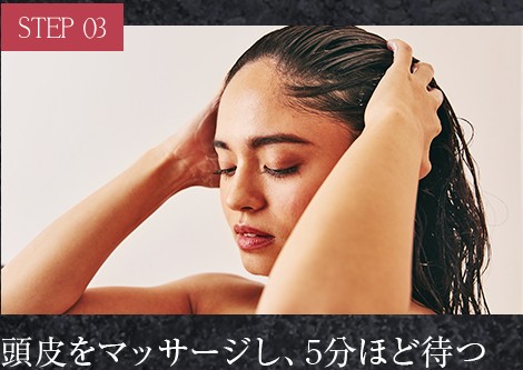 2.ぬらした頭皮と髪に適量をなじませ毛先までやさしく揉み込み3〜5分ほど置きます。